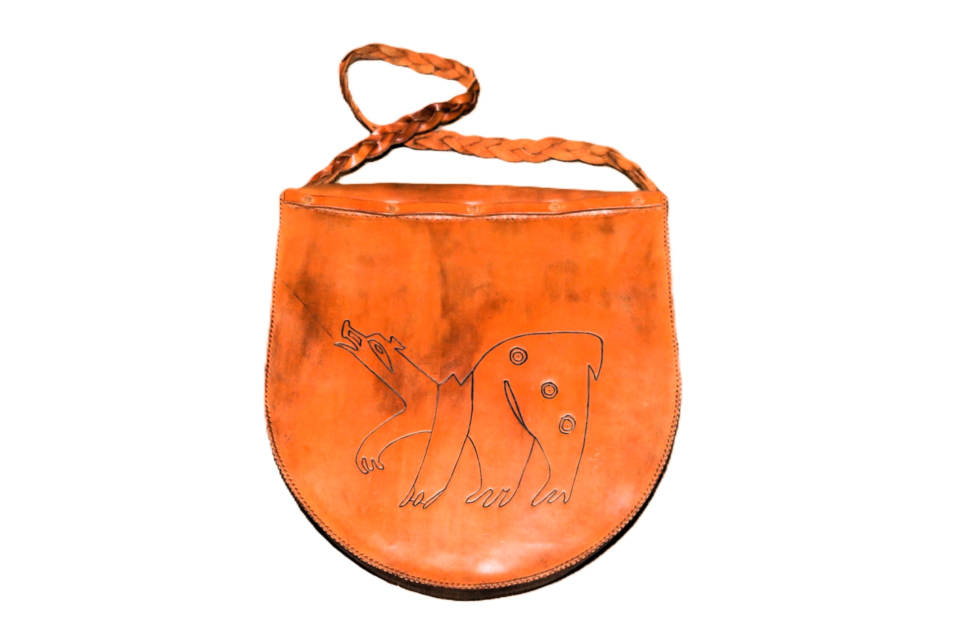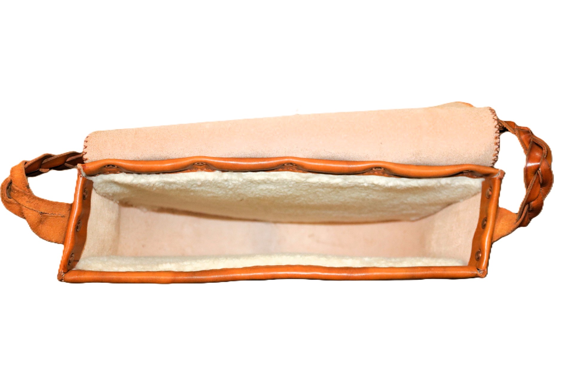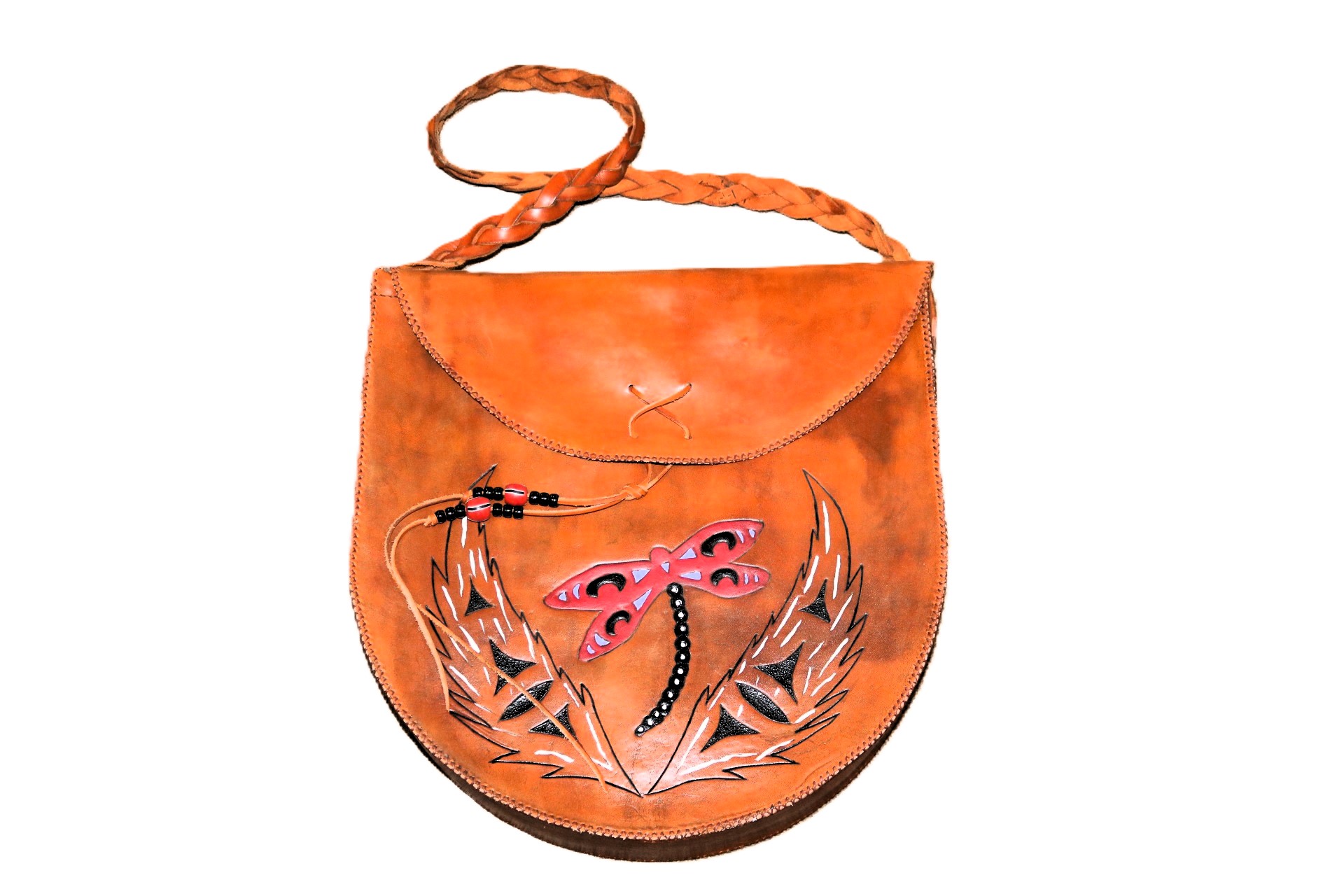 Made from our Chestnut Indian Tanned leather. Laced together with Sinew. Leather lace with Beads for closure on flap and braided shoulder strap. Lined with Sherpa. Design is hand-carved and then painted.