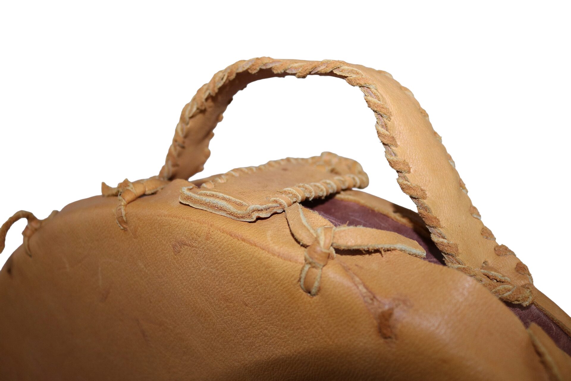 Made from our Chestnut Indian Tanned leather, acorn leather and leather lace. Inside of top is lined with sherpa and the bottom has intricate design carved in it (see picture). Leather handle is wider edged in leather lace. Closure to case is a tongue and with loop through style closure.