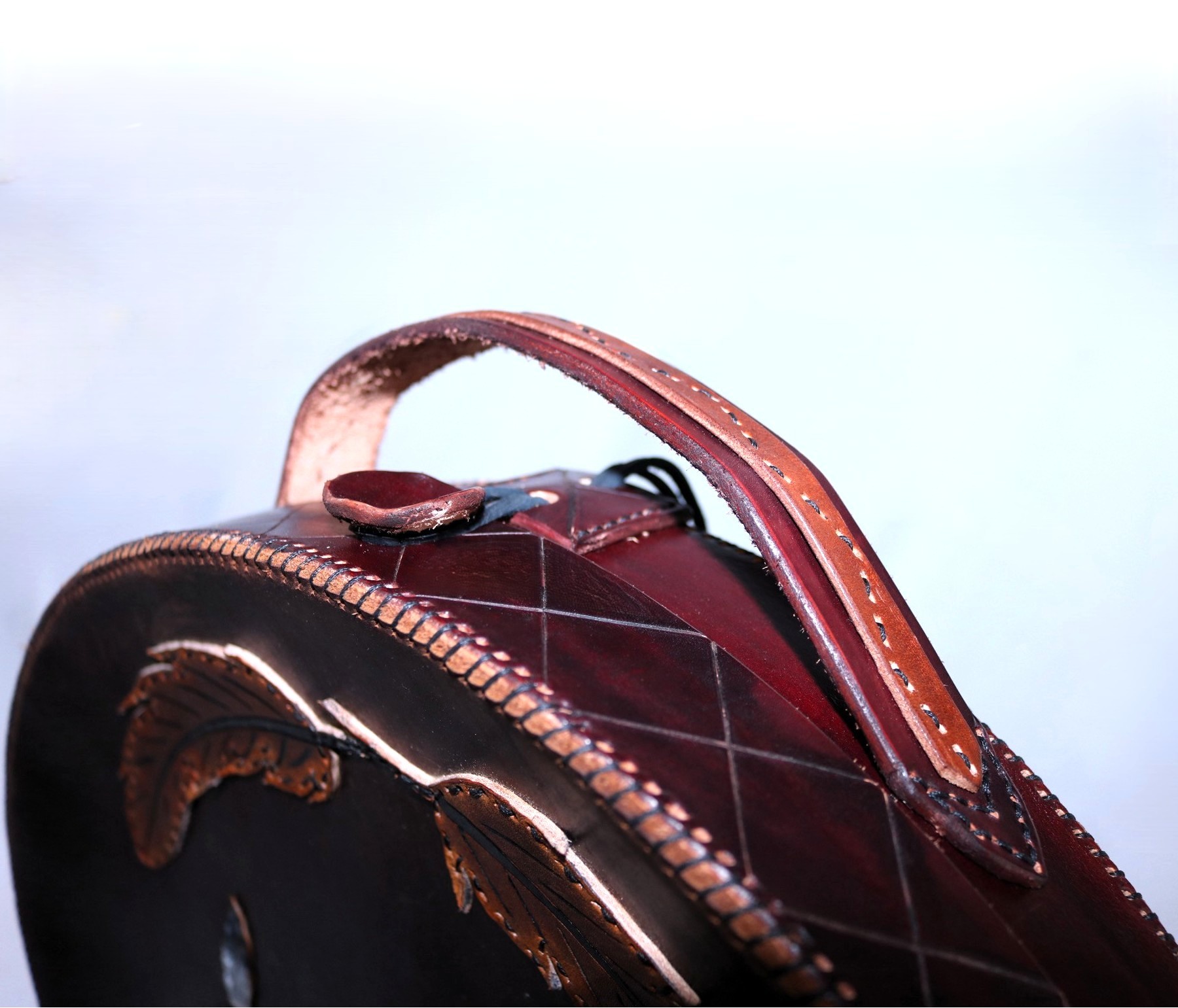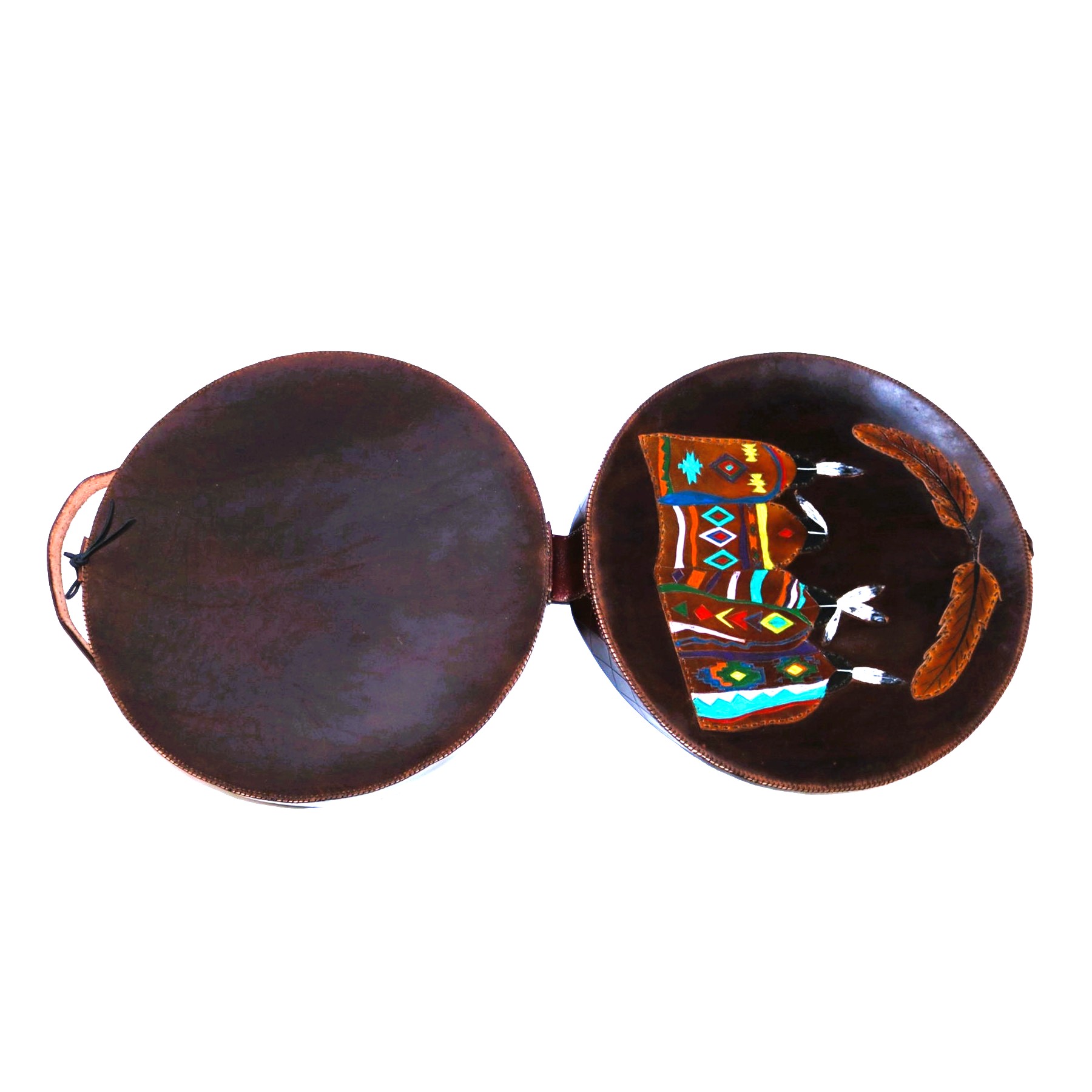 Made from our Chestnut Indian Tanned leather, leather lace, and sinew. Inside is lined with sherpa. Intricate carved design around lid edge and handle. Added cut out chestnut Indian tanned leather pieces added to front cover of feathers and Elders. Hand painted adding color and definition.  Closure to case is leather lace and button.